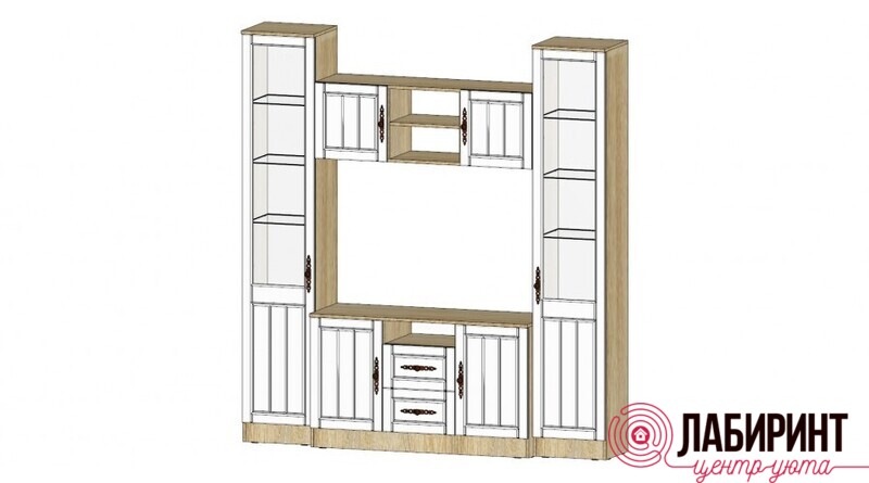 Центральная часть с тумбой ТВ «Виктория». Коллекция предоставляет широчайший выбор модульных элементов с возможностью комбинирования различных мебельных групп — спальни, гостиные и подростковые — для формирования функционального интерьера. "Виктория" является отражением модных мебельных тенденций и продумана до мелочей с точки зрения дизайна и удобства эксплуатации. Центральная часть оснащена ящиками полного выдвижения, а также системой открытых и закрытых полок, в которых Вы сможете разместить вещи, документы, книги, за стеклянными дверцами украсить полки статуэтками или семейными фото.