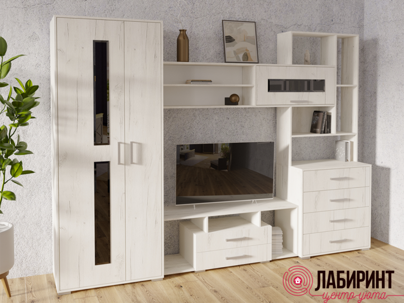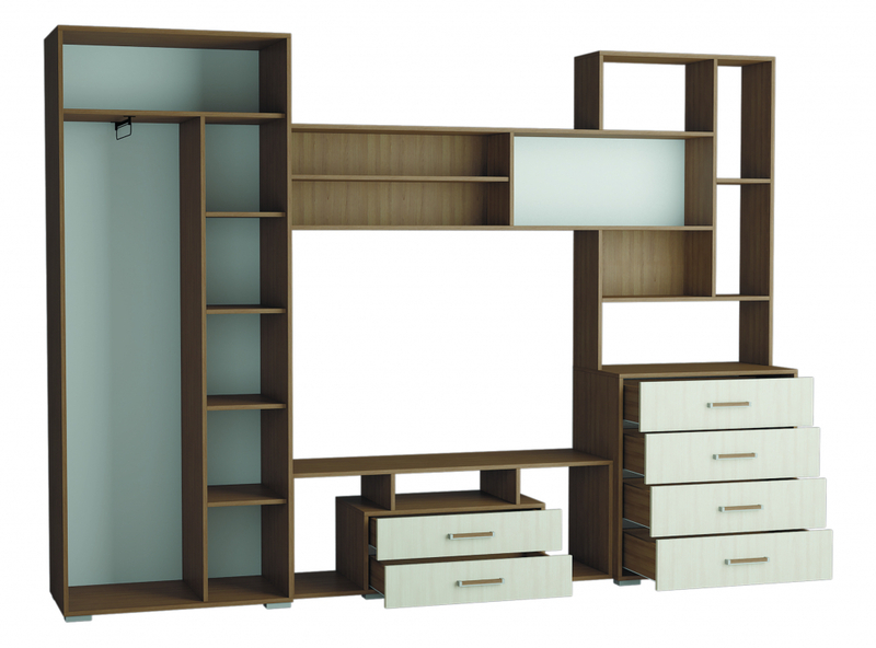 Вместительная гостиная ЕВРОПА-1 впишется в любой интерьер. Система открытых и закрытых полок, ящиков и шкафа для одежды делает гостиную более функциональной.