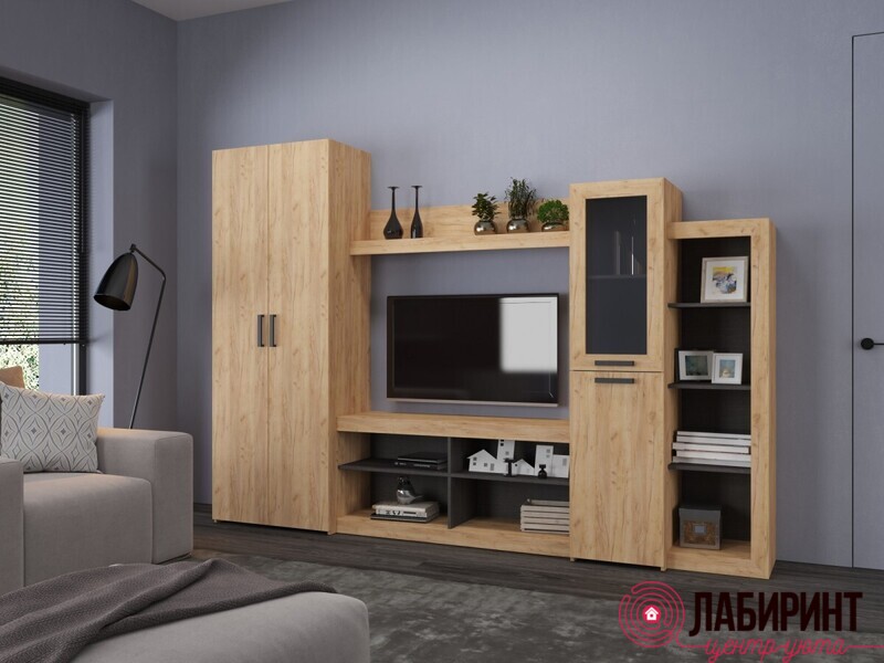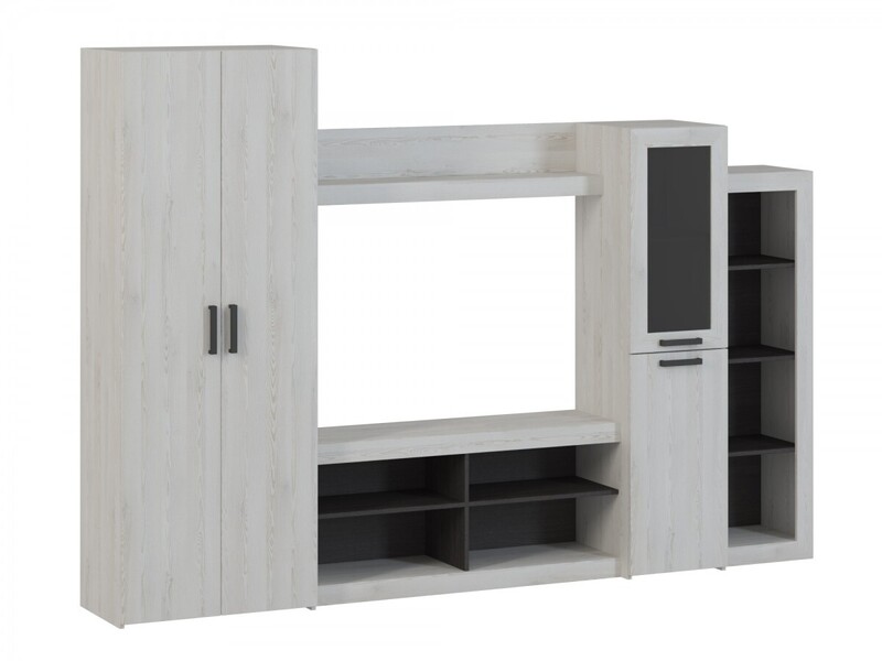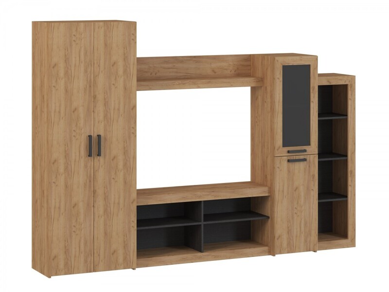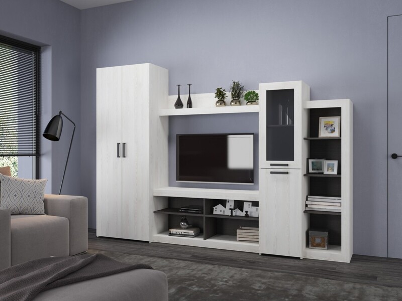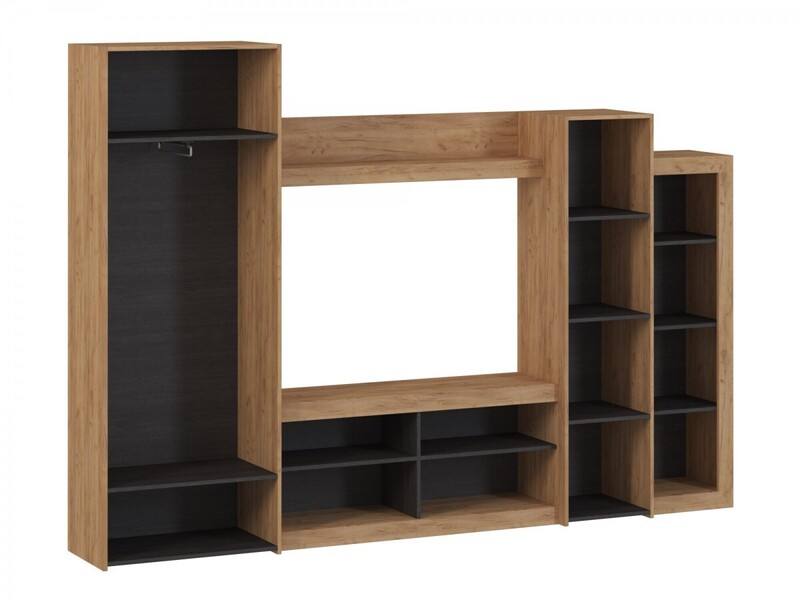 Вместительная стенка для небольших помещений. В гостиной «Оскар-4» предусмотрено: пенал, со стеклянной и глухой дверью, пристройка с открытыми полками, для хранения мелочей, бумаг, книг. Место для телевизора и аппаратуры. Полка для сувениров и фотографий. Плательный шкаф для хранения вещей на выдвижной штанге и на полках. За счет уменьшения высоты у пенала и пристройки, стенка имеет более облегченный вид.