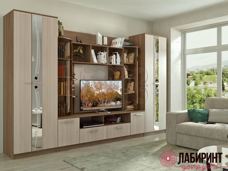 Стенка "Венеция" ЛДСП Шикарная современная модульная система с продуманным до тонкостей дизайном – для формирования уникального интерьера гостиной зоны. В оформлении использован пескоструйный рисунок на зеркалах и дверцы с тонированными стеклами.