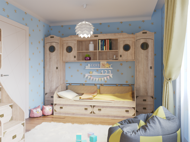 Шкаф-антресоль устанавливается над 1но ярусной кроватью между шкафами или пеналами.