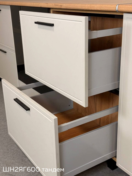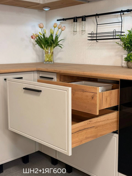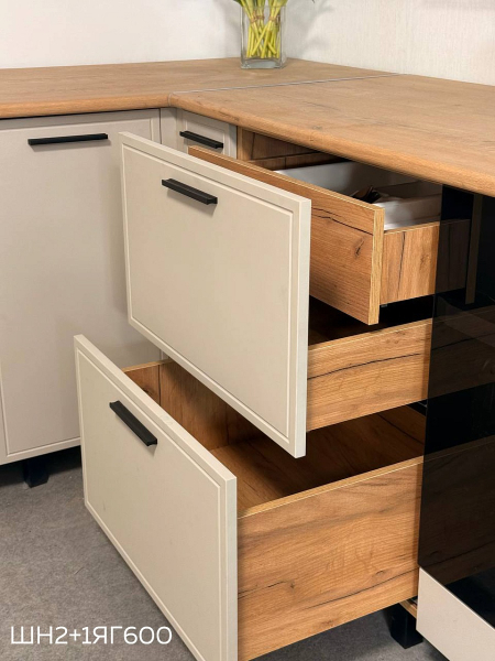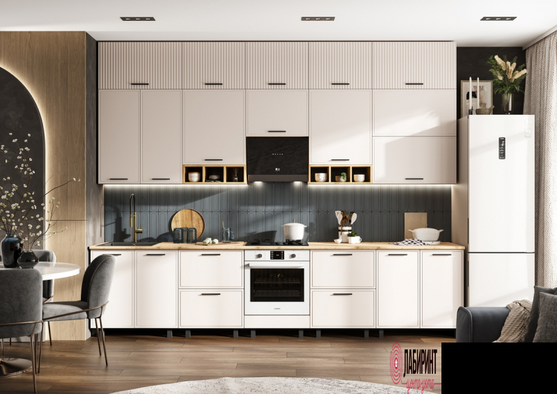 Кухня "Бьянка" 3,4 (1350) с элементами Люкс класса. Просторная кухня с элементами премиального дизайна для вашего дома. Этот готовый комплект кухни представляет собой решение повышенной комфортности, которое легко впишется в интерьер просторной квартиры или дома и создаст максимально удобное пространство для ежедневной готовки и семейных обедов. Такая прямая кухня помогает грамотно организовать кухню для квартиры или кухни для дома, где важно сочетание практичности, вместительности и стильного внешнего вида с элементами Люкс класса. Гарнитур кухонный выполнен в благородном сочетании фасадов Кашемир и корпуса Дуб крафт, что добавляет интерьеру глубину и статусный характер, а столешница Дуб вотан делает рабочую зону выразительной и практичной. Особенностью модели является разная глубина верхних и нижних шкафов, а также двухъярусное исполнение верхних модулей — это создает дополнительное пространство для хранения и придает кухне более монументальный и дорогой вид. Черная фурнитура выступает стильным акцентом, подчеркивающим современный дизайн.